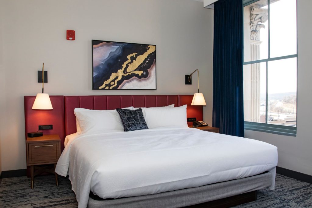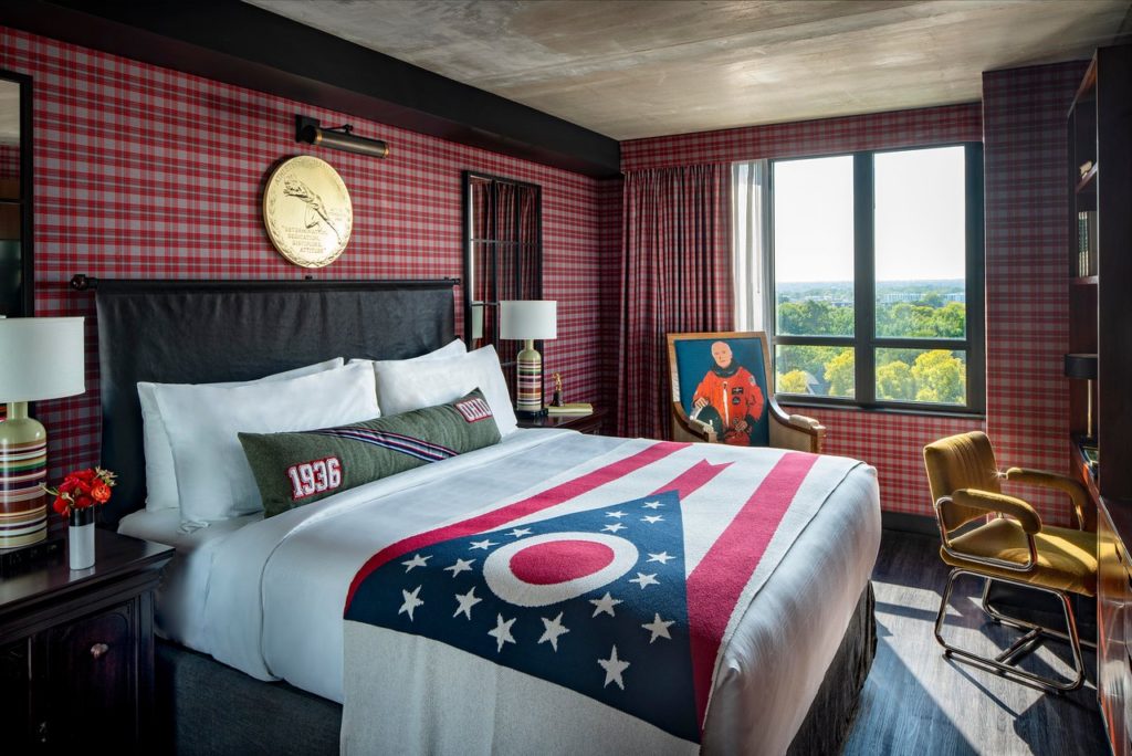Graduate Hotels are a small boutique chain which carefully tailors their eclectic decor to the history and character of each city. For the Graduate Columbus, that means a palette dominated by OSU’s signature scarlet and gray, along with a vintage inspired feel that references Ohio icons. (Be sure to check out the dining room chandelier that pays tribute to “The Best Damn Band in the Land”– it’s also on our list of must-visit Ohio State University tourism spots).